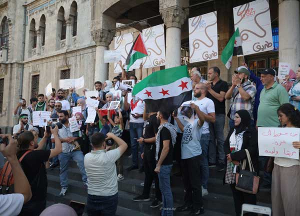 نظّم نشطاء سوريون وفلسطينيون من شبكة “كلنا غزة.. كلنا فلسطين” وقفة تضامنية في ساحة الحجاز بدمشق، تنديداً بالعدوان الذي استهدف أسطول الصمود، وتأكيداً على دعمهم للأحرار المشاركين فيه، حيث رفعوا الأعلام السورية والفلسطينية ولافتات تعبر عن وقوفهم إلى جانب غزة وفلسطين.