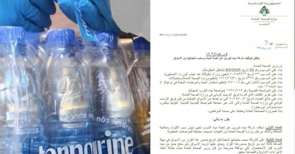 أصدرت وزارة الصحة اللبنانية قراراً، يقضي بتوقيف شركة “مياه تنورين” عن تعبئة مياه الشرب بسبب تلوثها بالبكتيريا.
