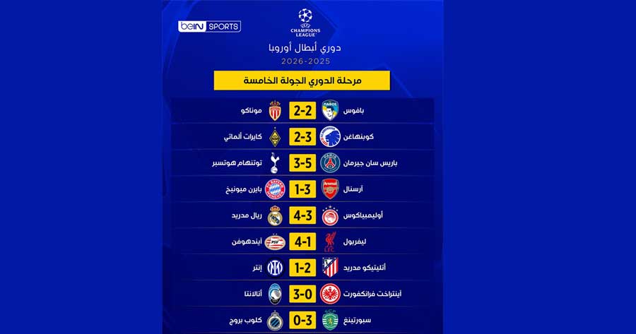 نتائج مواجهات من الجولة الخامسة ضمن بطولة دوري أبطال أوروبا 27.11.202527.11.20255 ✉ TG WA in X f مشاركة