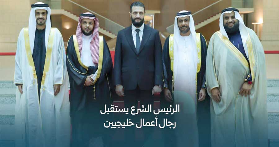 السيد الرئيس أحمد الشرع يستقبل في قصر الشعب وفداً من رجال الأعمال والمستثمرين الخليجيين برئاسة السيد عبد الله بن مطر المناعي رئيس مجلس إدارة شركة الإمارات للمزادات وبمشاركة المهندس عبد العزيز المديهش والدكتور محمد السويدان والسيد علي المعلا.