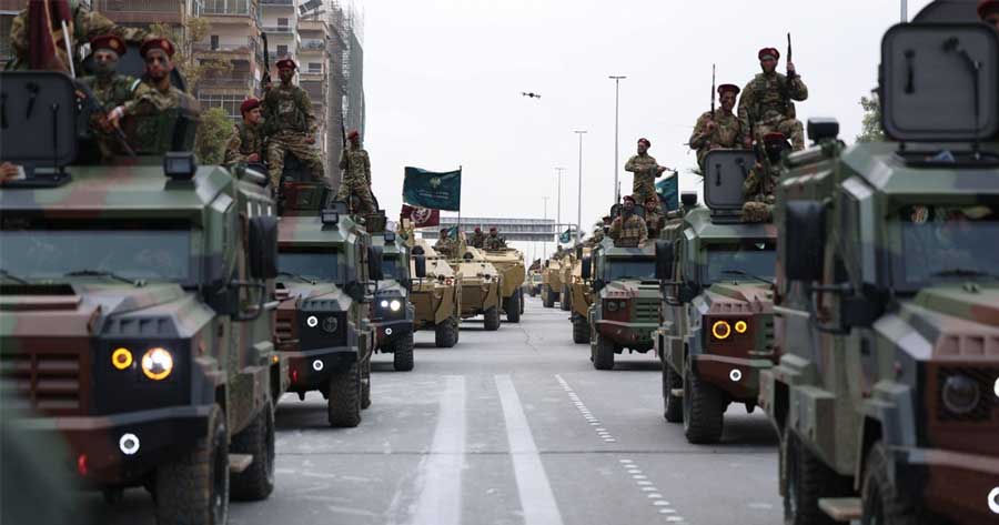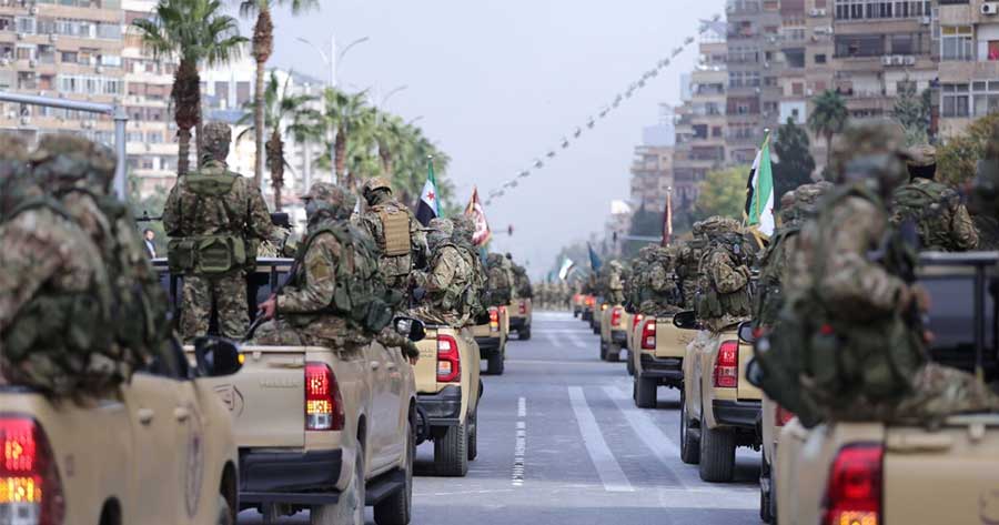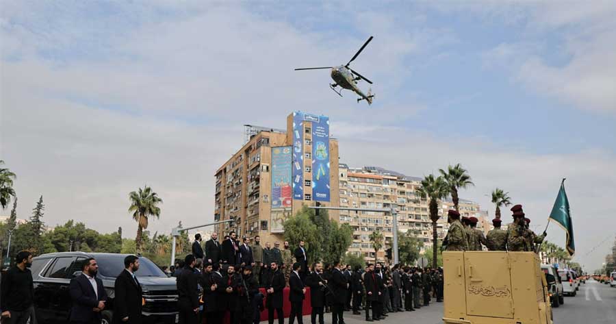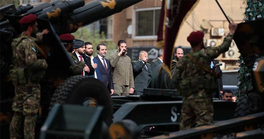 السيّد الرئيس أحمد الشرع يحضر العرضَ العسكري الذي أقامته وزارة الدفاع في العاصمة دمشق، بمناسبة الذكرى السنوية الأولى لتحرير سوريا، يرافقه عددٌ من الوزراء وكبار القادة العسكريين والمسؤولين.