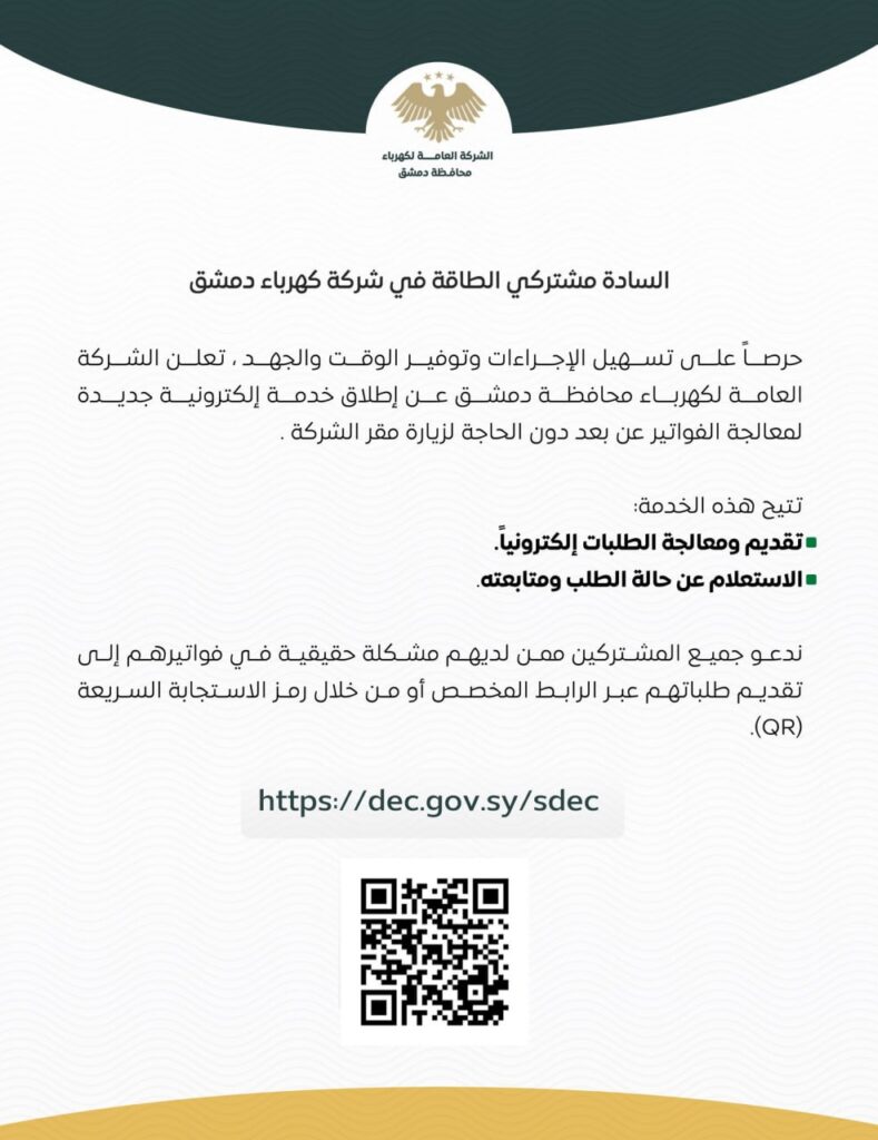 ويأتي إطلاق هذه الخدمة في إطار سعي الشركة العامة لكهرباء دمشق إلى تطوير خدمات\ها الإلكترونية، وتبسيط الإجراءات الإدارية، وتحسين جودة التواصل مع المشتركين، بما يسهم في تخفيف الازدحام على مراكز الخدمة، وتسريع معالجة الطلبات.