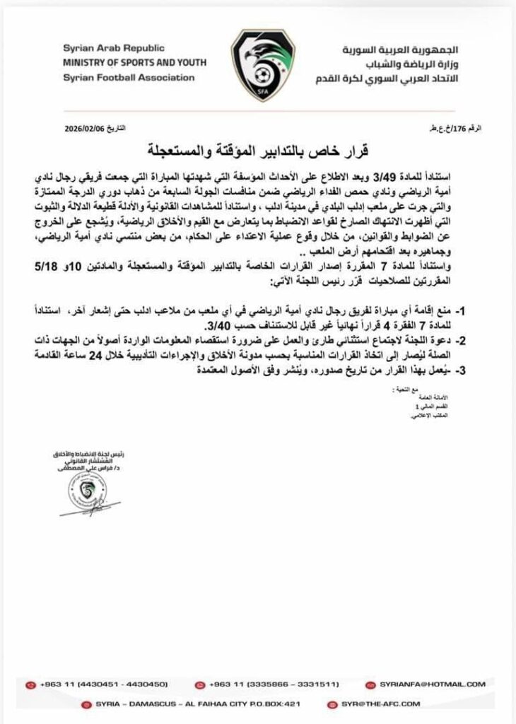 الوزارة تؤكد على أهمية الحفاظ على الرياضة السورية وضرورة احترام القوانين واللوائح.