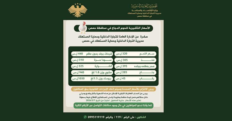 الأسعار التأشيرية للحوم الدجاج في محافظة حمص 07.03.202607.03.20260 ✉ TG WA in X f مشاركةالصدى- حمص- عامر العليأُعلنت الأسعار التأشيرية للحوم الدجاج في محافظة حمص، على أن يبدأ العمل بها اعتباراً من يوم السبت الموافق 07/03/2026، وتبقى سارية المفعول حتى صدور لائحة جديدة تحدد الأسعار المحدثة.