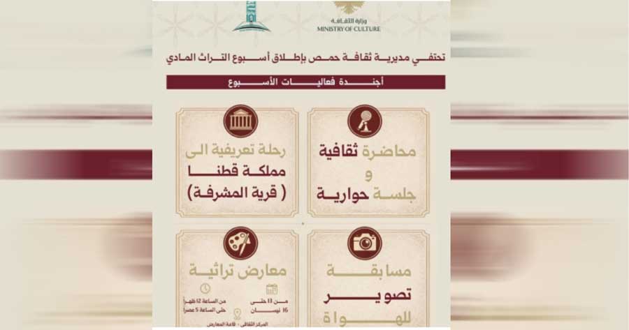 تحتفي مديرية ثقافة حمص بكنوز الحضارة في أسبوع التراث المادي، الفعالية الثقافية التي تضيء على أهمية الموروث المادي في صون الهوية الثقافية وتعزيز الوعي بقيمته.